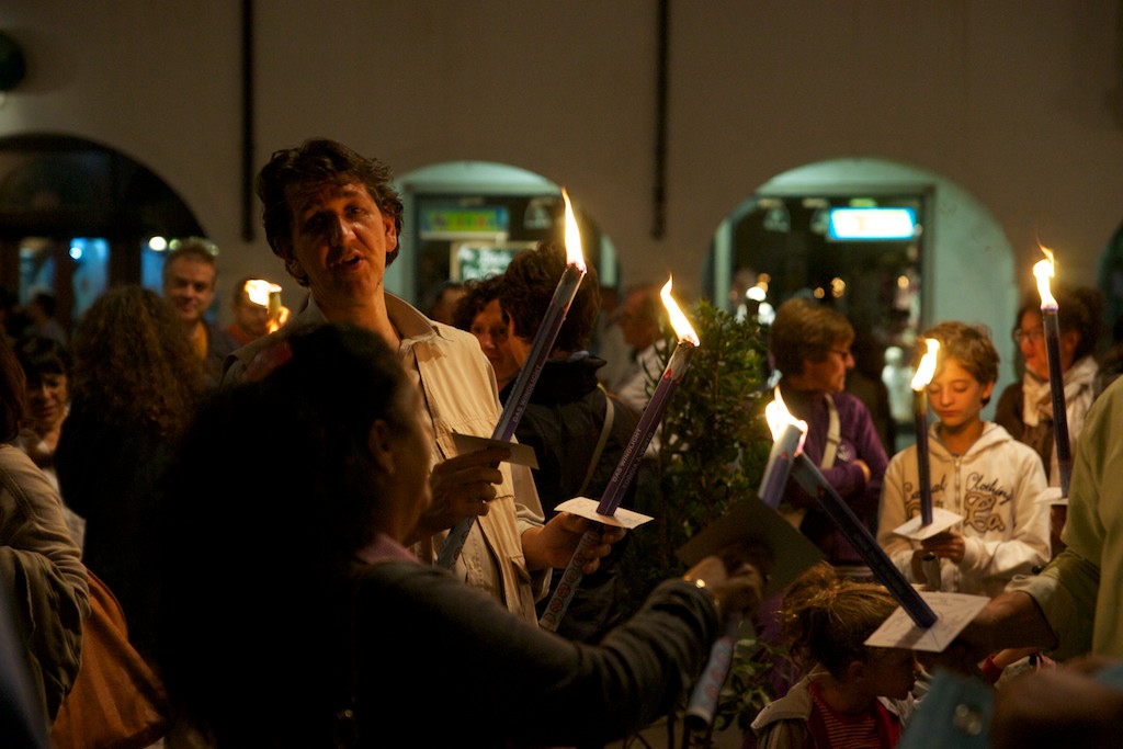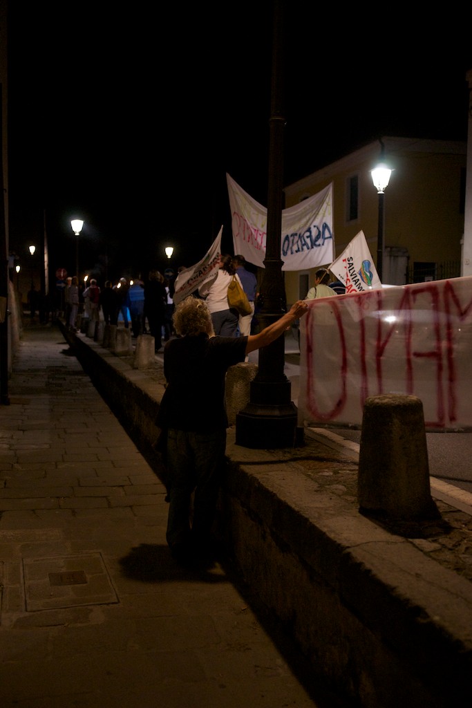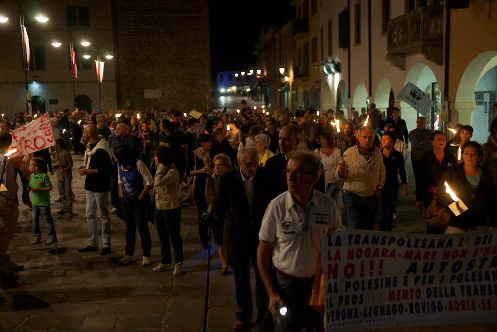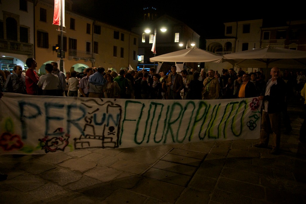Una grande fiaccolata ha illuminato ieri sera, venerdì 28 settembre, le strade di Monselice. Una grande fiaccolata per dire no al cemento, no ad una economia tumorale che macina ambiente e salute per garantire il profitto di pochi sui diritti di tutti. Perlomeno settecento persone hanno accolto l’appello “Per non morire di cemento” lanciato dai comitati della Bassa Padovana “Lasciateci respirare” ed “E noi?”, e si sono date appuntamento in piazza Mazzini per dare vita ad un pacifico corteo notturno. All’iniziativa ha aderito pressoché l’intero arcipelago associazionista del Veneto. Una bella serata di festa per Monselice, con tanto di banchetto informativo che, oltre a raccogliere firme, distribuiva torte, pizze e bicchieri di vino.