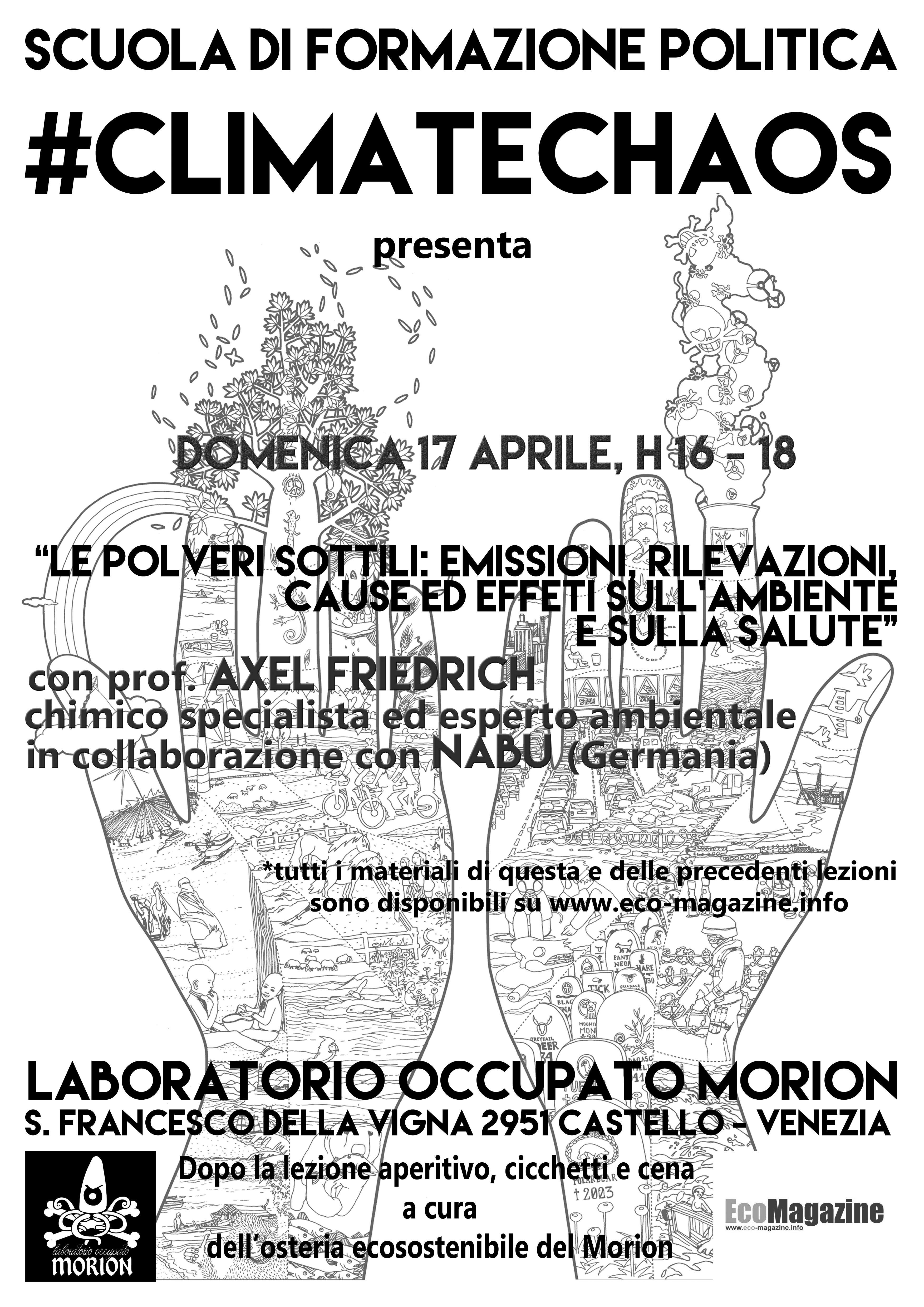 Riprendono le lezioni della scuola #ClimateChaos al Morion. Domenica 17 aprile, dopo aver votato al referendum sulle trivelle, appuntamento con Axel Friedrich, esperto e consulente internazionale ex capo divisione del settore “Ambiente eTrasporti dell’Agenzia Federale per L’Ambiente della Germania e co fondatore del Consiglio Internazionale per i Trasporti Puliti.