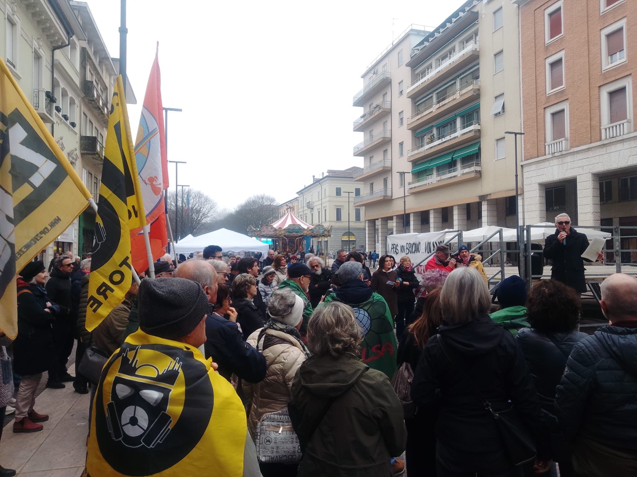 Giovanna Dal Lago, mamma No PFAS da sempre in prima linea per chiedere la messa al bando di queste sostanze, incalza la piazza: «Non voglio vedere i signori che hanno inquinato i miei figli e i territori dove viviamo in galera, voglio vederli con pala e cariola in mano a ripulire e bonificare, perché ai miei figli ho insegnato che quando si sporca si pulisce: è la base della civiltà».